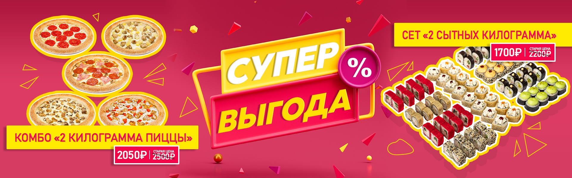 Вводите промокод 2005, чтобы получить "Комбо 2 килограмма пиццы" за 2050 рублей вместо 2500 рублей.